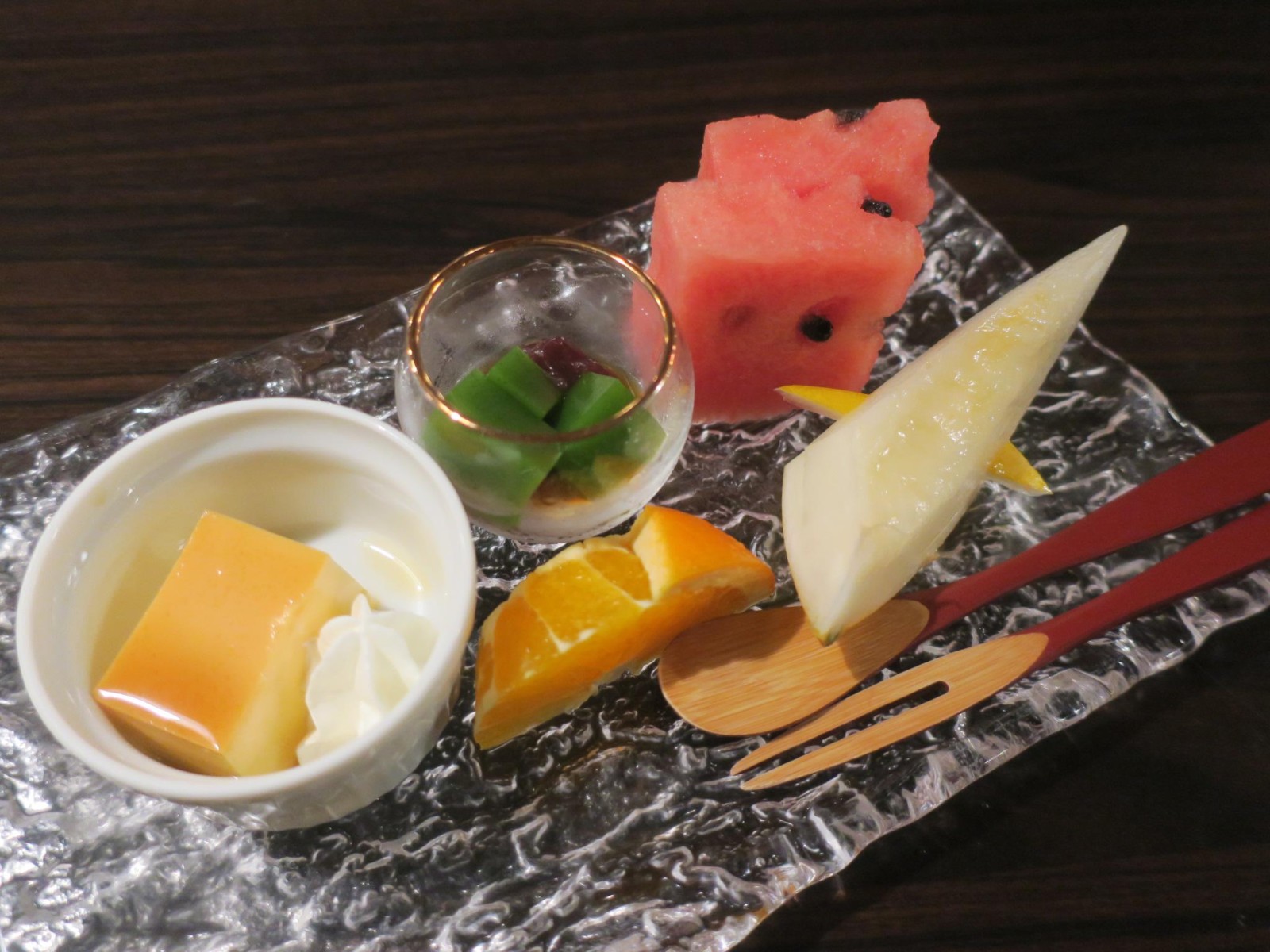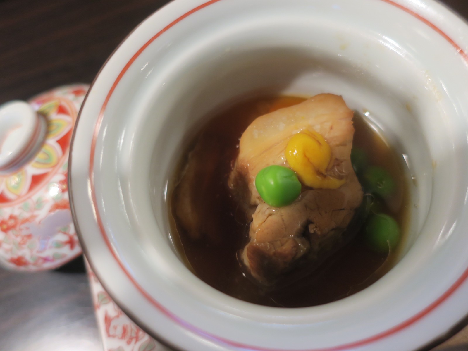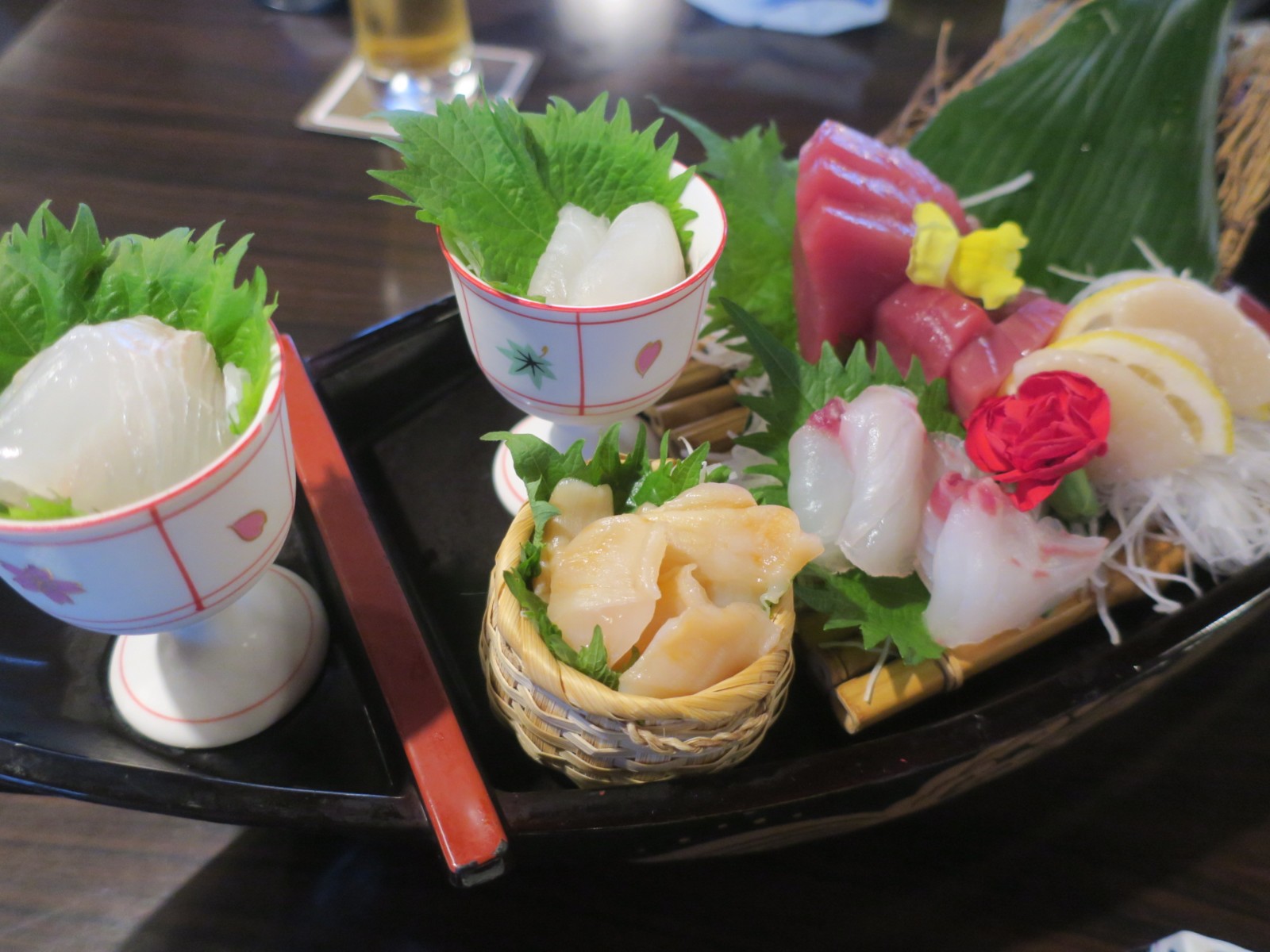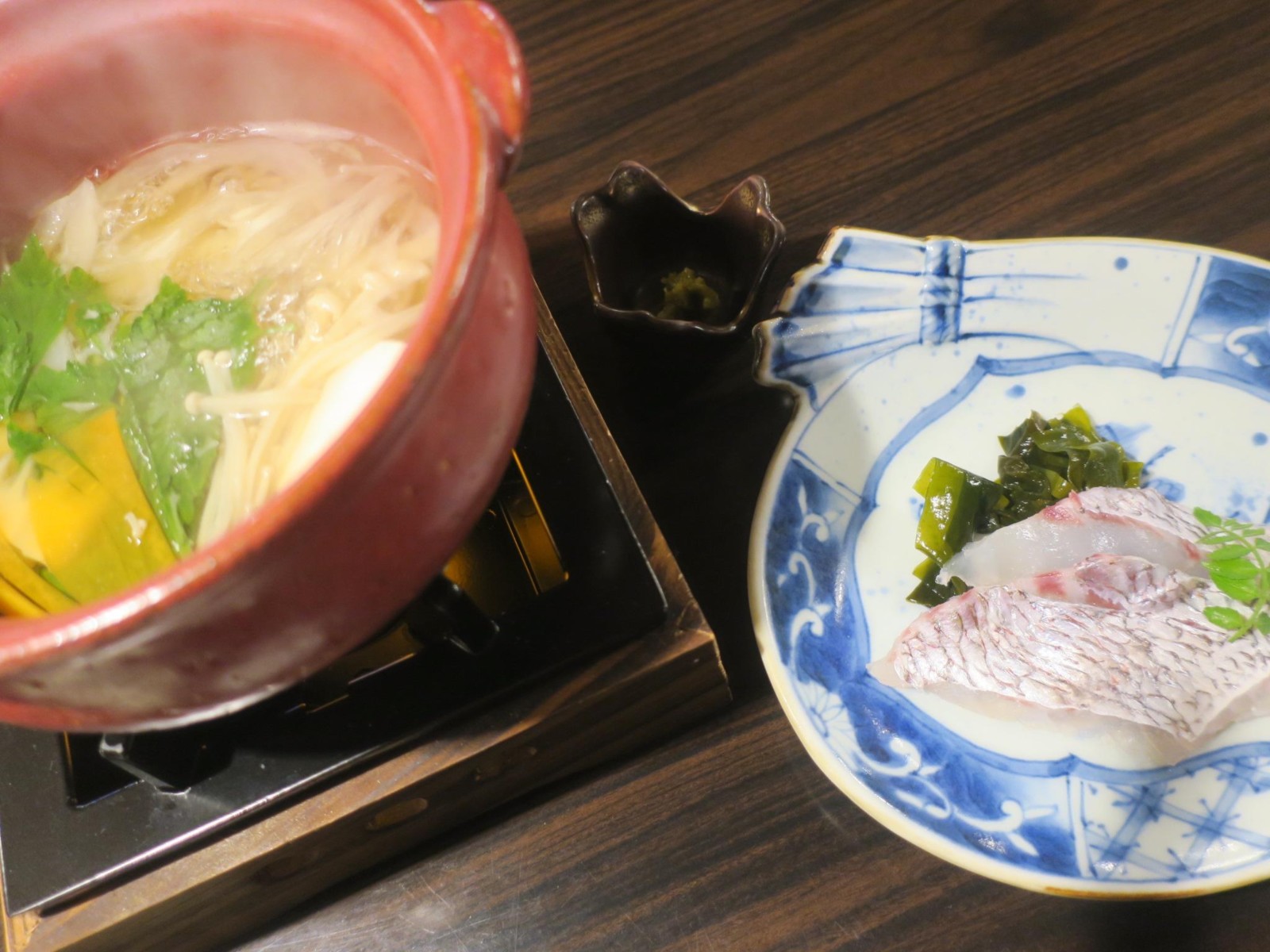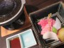 夕食の前菜は玉子豆腐、小肌卯の花添え(郷土料理)、白美瑠貝独の活雲丹添え、空豆黄味寿司、筍博多真丈、重ね椎茸、車海老の山菜射込みでした。お造り(下の写真は2人分)はかつお、鯛、何かの貝と、貝柱みたいなのと白身の魚です。温物は保美豚の角煮(味は濃いめ)でした。お凌ぎは柏葉寿司で、見かけよりも食べ応えがありました。焼き物は和牛(美濃牛だったか大垣牛とか言ってました)とアオリイカの石焼きでした。肉は見かけより脂っこくなかったです。鍋物は天然真鯛のシャブシャブと春野菜でした。そしてあさりの炊き込みご飯と赤だしが出て。漬物は自家製でした。デザートはフルーツ3種類、ミニあんみつ、プリントでした。なお、この宿の食事は他人の口コミだとすご高くなっていましたが、私の実感ではまずまずという感じでした。 |