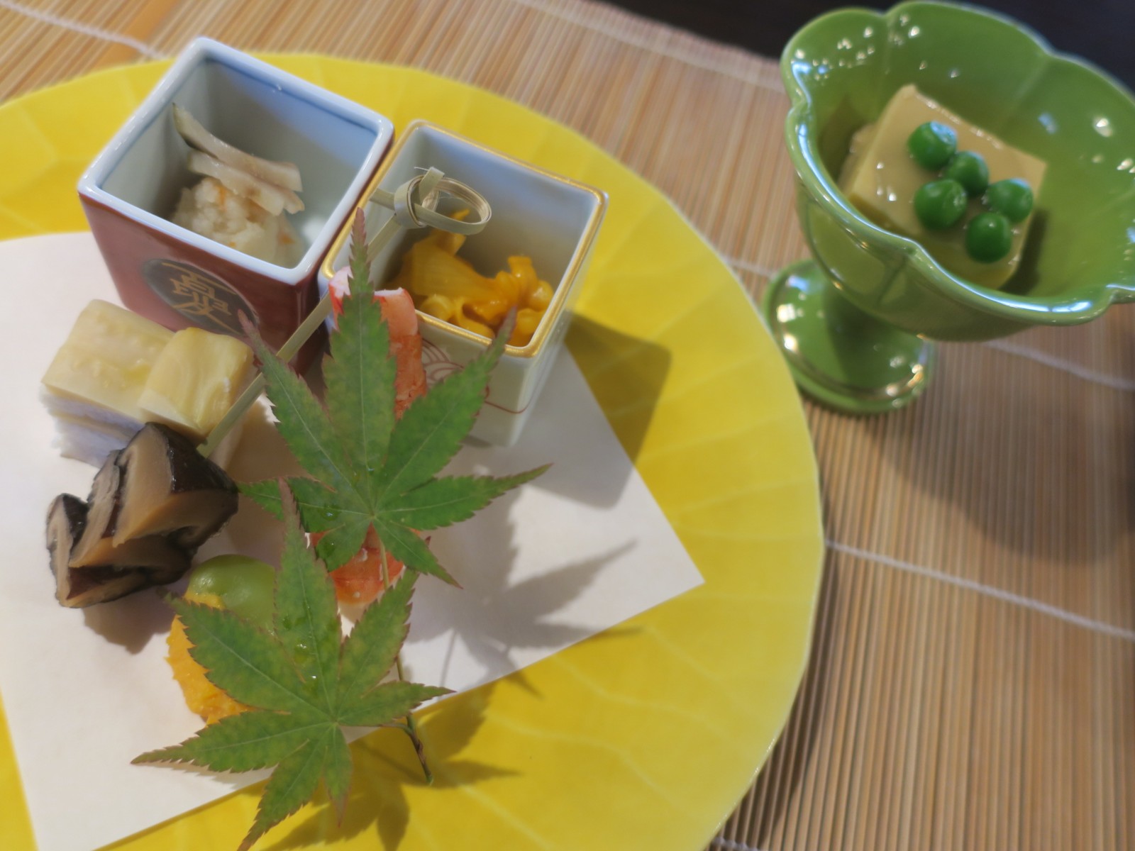 チェックインのすぐあとには、ドリンクとおつまみがいただけるフリータイム(15時〜17時)がありました。場所は食事の間で、ドリンクには生ビールやりんごジュースなど、おつまみには豆などのほか、大粒の黒豆が入ったパウンドケーキもありました。このパウンドケーキはとてもおいしく、宿のおみやげコーナーで販売もしていました。1つ2,500円でお値段はけっこうしますけど。 |
