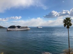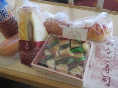 お昼ごはんは神戸阪急デパートで買った姫路の穴子寿司と神戸のイスズベーカリーのパンにしました。いろんな食べ物を広げられるところは船旅のよさです。
