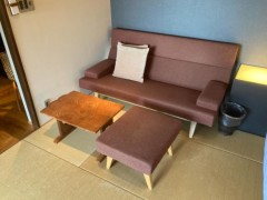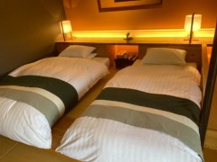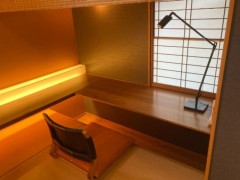 和室だけど寝る時はベッドだからラクです。そしてベッドの横には和風のデスクコーナーもありました。