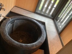 夕日を見ながら入浴ができる石の湯舟。その隣りにはシャワーブースがありました。
