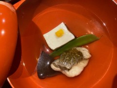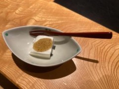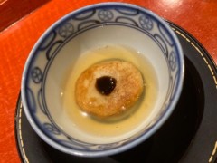 前菜は以前と器を変えていました。中身はニシ貝と小エビが恒例の品で、あと3品はいろいろ変えてあります。