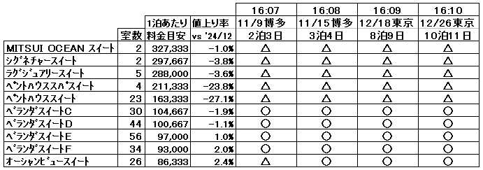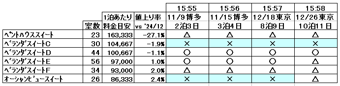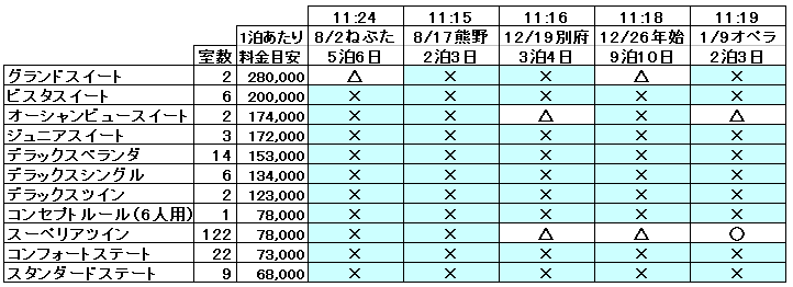 一方、単価がかなり高い三井オーシャンフジのほうは、夕方になっても空きがたくさんでした。こちらは全部で50以上ものコースがあったので一部のコースを見ただけですが、いちばん日程が短い11月9日〜11日の博多発着・済州島クルーズ、2番目に短い11月15日〜18日の博多発着・松山/釜山クルーズ、ふつうなら人気の出そうな12月18日〜26日の横浜発着・クリスマスクルーズと12月26日〜1月4日の横浜発着・年末年始クルーズが、いずれも空き放題です。それと、今回はカテゴリーが下から3つの部屋はやや値上げになる一方で、上位のペントハウススパスイートとペントハウススイートは20%台という大幅な値下げになっていました。
