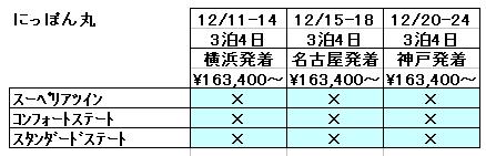 さて、昨日は商船三井クルーズから「来年の5月10日でにっぽん丸が引退」という発表がありました。建造から35年も経った客船なので、そろそろかとは思っていましたが。ちなみに、にっぽん丸の人気は7月前半と8月の1クルーズを除けば上々で、例えば今年12月のクリスマスクルーズ予約状況は下表のとおり(料金は株主優待割引を使用時、ジュニアスイート以上は省略)で、よく埋まっています。