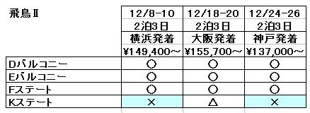 例えばにっぽん丸と同じくらい古い飛鳥IIの今年のクリスマスクルーズの予約状況は下表のとおり(これもジュニアスイート以上は省略)で、いちばん安いKステート以外はほとんど埋まっていません。見た目の単価はにっぽん丸よりやや低めですが、1泊当たりの単価は割引を使っても7万円以上だから割高感があるんでしょうね。