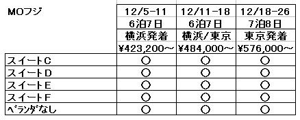 また、昨年12月にデビューした三井オーシャンフジの今年のクリスマスクルーズ(ジュニアスイート以上は省略)も全然埋まっていません。1泊あたりの単価(割引使用時)は飛鳥IIと同等だけど、どのコースも長いので、1航海あたりの価格はかなり高いし。