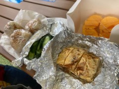 なお、万博会場でのお昼ごはんはどこも満席だろうし、席があってもすごく高料金だろうと思われたので、弁当を持参しておりました。弁当の中味は松茸ごはんのおにぎり、だし巻き、胡瓜の浅漬け、そしてデザートの柿です。食べる場所は意外にすぐ確保できて、これはラッキーでした。