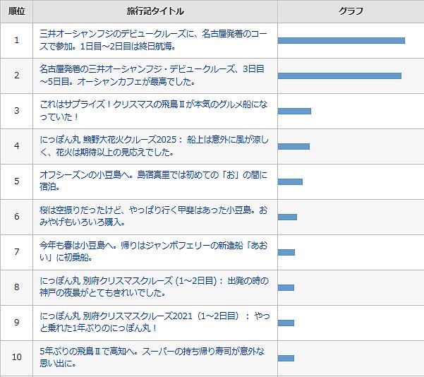 さて、私が旅行口コミサイトのフォートラベルに三井オーシャンフジのデビュークルーズの乗船記を投稿してからもうすぐ1年になるのですが、この乗船記は今月に入っても私の旅行記の中でアクセス数がダントツになっています。値段が高すぎて乗る人は少ないのに、乗船記だけは見に来る人が末永く多いって、なんだか不思議な気がします。