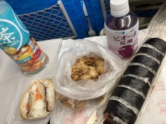 帰りの電車に乗る前には前日の昼に訪れた「べっぷ駅市場」の「上野商店」で海苔巻きと大型いなりずしと鶏の唐揚げを買いました。これは電車の中でお昼ごはんにいただいてます。