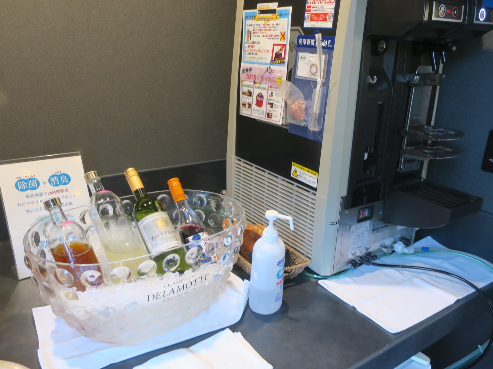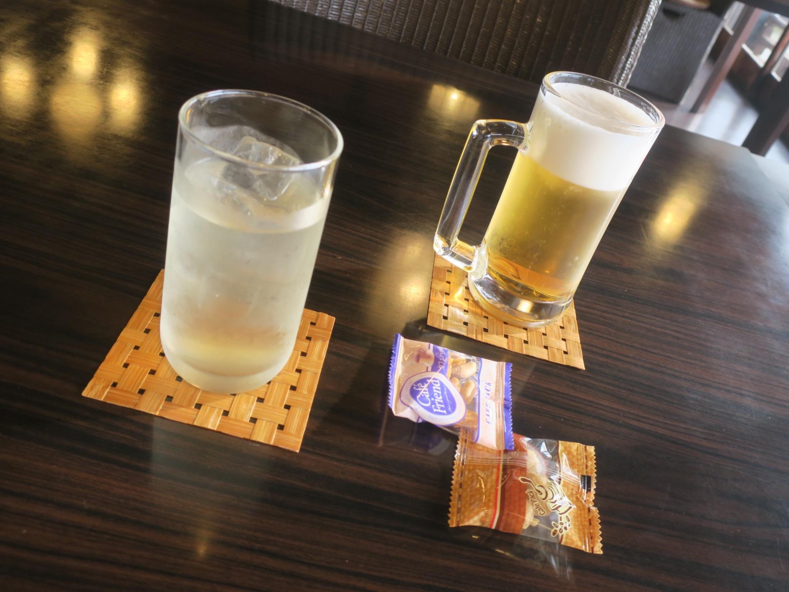 チェックインのすぐあとには、ドリンクとおつまみがいただけるフリータイム(15時〜17時)がありました。場所は食事の間で、ドリンクには生ビールやりんごジュースなど、おつまみには豆などのほか、大粒の黒豆が入ったパウンドケーキもありました。このパウンドケーキはとてもおいしく、宿のおみやげコーナーで販売もしていました。1つ2,500円でお値段はけっこうしますけど。 |