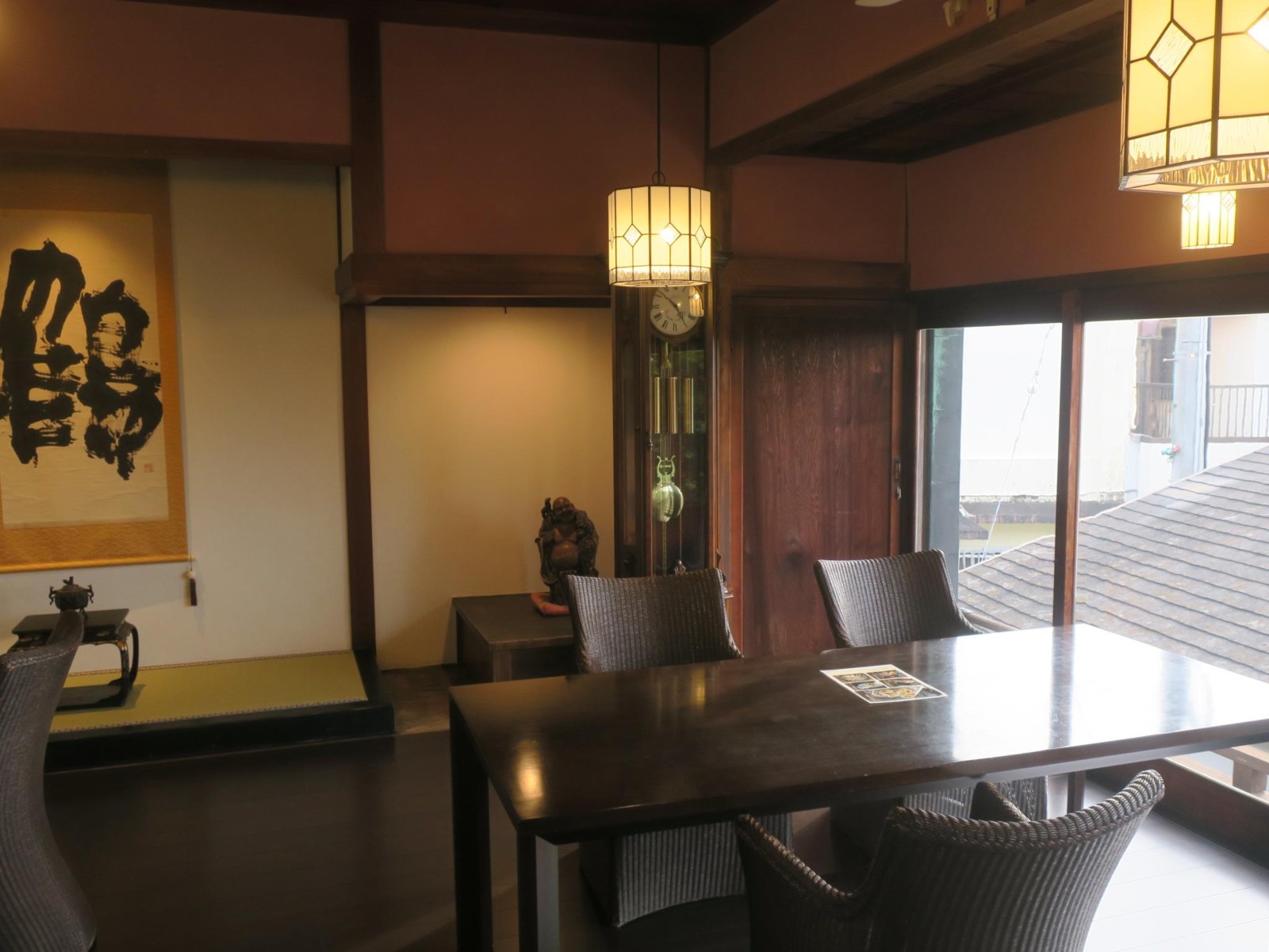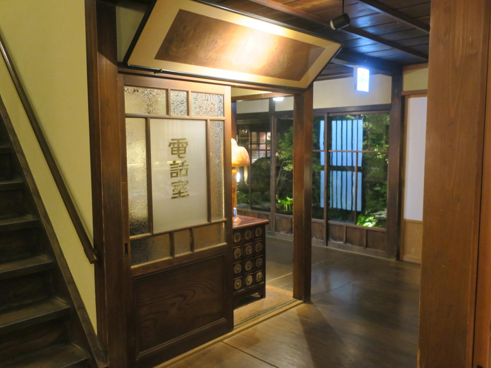 この日の宿は本館が国の登録有形文化財に指定されているという「角上楼」です。宿に着くと、まずはレトロなロビーでチェックインです。応対の方はとても日本語が上手な若いネパール人の女性でした。他の若いスタッフもほとんどがインドシナ半島以西のアジアの国々の人たちでした。