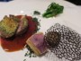 肉料理は飼い主が仔羊 背肉のロースト ペルシエ、私は黒毛和牛サーロインステーキをセレクトし、途中でお互いに味見のため少しシェアしました。これらもお茶がまぶしてあるほか、写真の中の茶色い網目のものはほうじ茶で作ってあるとのことでした。どちらもとてもおいしかったです。特に牛肉のほうはけっこういい肉を使っており、飛鳥Uのステーキに味わいが似ていました。