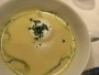 本日のポタージュスープもお茶葉入りで、抹茶のニョッキも入っていました。塩味はほんのちょっとだけ強めでしたが、これもおいしかったです。ただ、この順番でスープが出てくるというのは変わっていますね。
