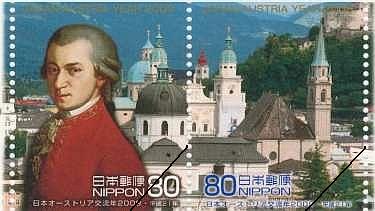 上から3段目はウィーンからドナウ川を西に80kmほど遡ったところにあるメルク修道院(欧州屈指のバロック建築)の切手です。メルクは人口5千人程度の田舎町ですが、実を言うとここは「オーストリア」という地名(正確には「オスタリーヒ」)が文献に初めて現れたとき、その国の主の城があったった町なんですよ。時はハプスブルク家より約300年も前の、バーベンベルク家初期のことです。そして、そのバーベンベルク家の城があったのは、今回の切手に載っている修道院の場所なのです。 下から2段目の切手はザルツブルクとモーツァルトですね。これは何も説明する必要がないでしょう。そうそう、この2枚の切手のちょうど真ん中にある教会はコレギエン教会というのですが、これはモーツァルトのお父さんが中退したザルツブルク大学(私もここに留学してました)の付属教会なんですよ。